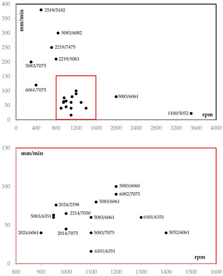Optimizing the process parameters of friction stir welding is significantly influenced by the complex thermal and mechanical interactions induced during the welding process [36]. In regard to this fact, it is not possible to identify a unique strategy to join two similar or dissimilar materials with this process. Consequently, there is a wide selection of literature that investigates the best combinations of parameters as a function of the materials to be joined.