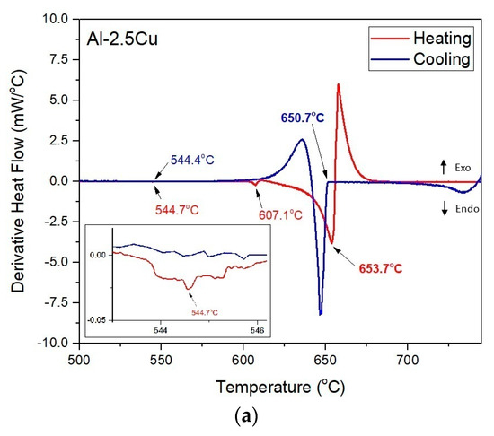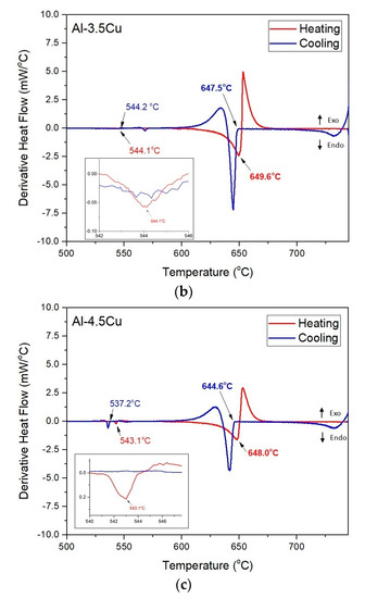 The thermal curves obtained from DTA analyses for the binary alloys are presented in Figure 2. During the heating of the alloys (red curves), it was noted one slight first peak at 544.7 °C for the Al–2.5Cu alloy (Figure 2a), corresponding to the temperature for the start of melting (Solidus temperature). This peak was observed for the Al–3.5Cu alloy at 544.1 °C (Figure 2b), while the Al–4.5Cu alloy showed this transformation at 543.1 °C (Figure 2c). Still considering the heating curves, the end of melting (corresponding to the Liquidus temperature) was given at 653.7, 649.6, and 648.0 °C for the Al–2.5Cu, Al–3.5Cu, and Al–4.5Cu alloys, respectively. As these curves are related to the heating step, the lowest endothermic peaks correspond to the melting point of the alloys. In all curves, the onset of these peaks ranging from 600 to 610 °C, which represents the temperature at which the material starts to melt. During the cooling of the alloys (blue curves), TL was determined at 650.7, 647.5, and 644.6 °C for the Al–2.5Cu, Al–3.5Cu, and Al–4.5Cu alloys, respectively. For the Al–3.5Cu alloy, an isolated unexpected peak was observed at 568.1 °C. Related to the Solidus temperature determined in the cooling curve (indicated by the second peak), the values were 544.4, 544.2, and 537.2 °C for the alloys with 2.5, 3.5, and 4.5%Cu contents, respectively. As mentioned by Jaradeh and Carlberg [30], it is typical to determine the Solidus temperature from the heating curve and the Liquidus temperature from the cooling curve due to the accuracy of the obtained values. However, in the present results insignificant differences between TL (<4 °C) and TS (<6 °C) during heating and cooling conditions were observed. The two transition points observed in the curves correspond to the formation of the primary α–Al phase (matrix) at TL and the eutectic microconstituent (α-Al + θ) at TS. In summary, for the binary alloys, the increase of alloy Cu content decreases both TL and TS.