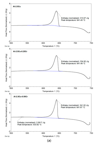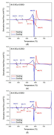 As observed in Figure 3, additional peaks were detected in the solidification intervals. For the alloys with 2.5%Cu, during the heating step (red curves), peaks appeared at 607.1 and 604.7 °C when the alloy Cr content was 0.25 and 0.50%, respectively. For the alloys with 3.5%Cu, heating curves showed intermediate peaks at 606.4 and 597.5 °C for the alloys with 0.25 and 0.50%Cr. With 4.5%Cu content, the alloys with 0.25 and 0.50%Cr showed quasi-identical peaks to those alloys with lower Cu contents, with peaks at 603.7 and 601.5 °C in the heating curves. When considering the cooling curves, intermediate peaks were only observed for the Al–3.5Cu–0.25Cr, Al–4.5Cu–0.25Cr, and Al–4.5Cu–0.50Cr alloys, at 573.3, 561.1, and 565.3 °C, respectively. This can be attributed to the diffusion of alloying elements during cooling when the amount of Cu and Cr is higher than a critical value. Aluminum alloys with small Cu and Cr additions can precipitate secondary phases or intermetallic compounds at low temperatures, such as Al–Cr and Al–Cu–Cr, and if the Fe is present, Al–Fe–Cr and Al–Cu–Fe–Cr. However, the formation of these precipitates depends on the solidification conditions and solute diffusion characteristics [17,31].