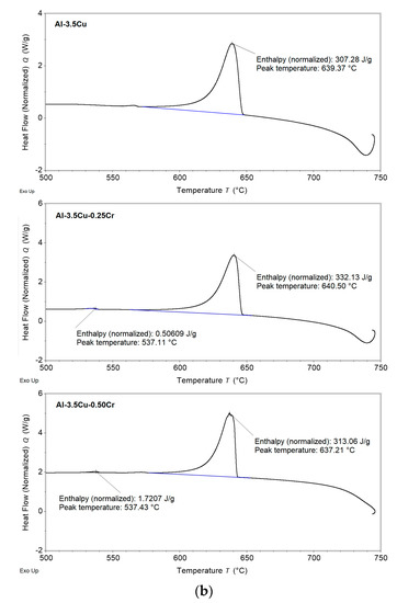 The transformation enthalpies (ΔH) determined on the cooling curves are shown in Figure 4a–c. The values were calculated using the TRIOS software and considering the baseline type linear, onset type inflection, applying the command “Execute—Intelligent” in the tool “Analysis”. For the Al–2.5Cu–xCr alloys (Figure 4a), the observed values were 313.07, 334.92, and 341.02 J/g for those alloys with 0, 0.25, and 0.50%Cr, respectively, indicating an increase in enthalpy transformation during solidification with the increase of the alloy Cr content. The alloy with 0.50%Cr showed a second peak closed at 533 °C with an enthalpy value of about 2.06 J/g, demonstrating that this transformation is related to a small amount of the transformed material. The alloys with 3.5%Cu presented values of 307.28 J/g, with 0.25 and 0.50%Cr the values were 332.13, and 313.06 J/g, respectively (Figure 4b). Once again, secondary peaks were observed at temperatures of 537 °C indicating transformations with a small amount of the phases. For the Al–3.5Cu–xCr alloys, the enthalpies did not demonstrate a tendency as a function of the alloy Cr content. As the alloy Cu content increased to 4.5% (Figure 4c), the enthalpy value decreased to 188.84 J/g, and 326.41 and 283.36 J/g with 0.25 and 0.50%Cr, respectively. In general, the enthalpy values decreased more significantly with the increase of the alloy Cu content, and less with the alloy Cr content variation.