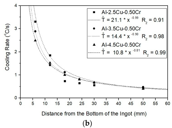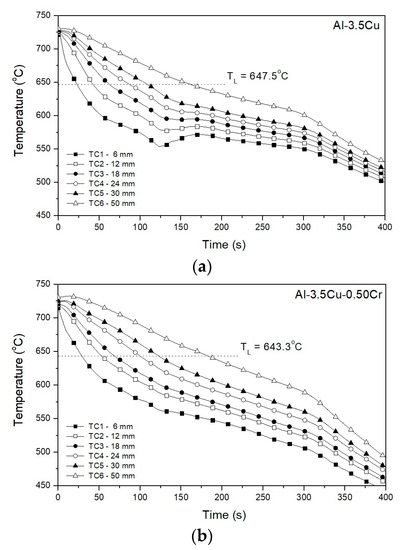 Figure 5a,b show examples of the thermal profiles obtained during directional solidification of the Al–3.5Cu binary alloy and Al–3.5Cu–0.50Cr ternary alloy, respectively. Liquidus temperatures determined from DTA data during the cooling step are indicated by horizontal dashed lines on the graphs. The cooling rates ( for each thermocouple were determined in the time corresponding to the Liquidus temperature.