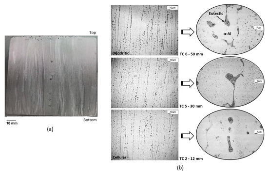 Longitudinal section macrographs of the ingots showed a complete columnar macrostructure in all alloys, with fine grains at the bottom of the ingots (under high cooling rates) and coarse grains close to the top of the ingots (under low cooling rates). An example is shown in Figure 7a for the Al–4.5Cu–0.50Cr alloy, which is the most critical alloy composition for exhibiting a columnar-to-equiaxed transition in the macrostructure. In Figure 7b, the microstructures of the Al–3.5Cu–0.25Cr alloy at the positions corresponding to the thermocouples TC2, TC5, and TC6 (located at 12, 30, and 50 mm from the bottom of the ingot, respectively) are shown. The solidified microstructure is composed of a directional cellular/dendritic matrix (primary α–Al phase) and a eutectic microconstituent (α–Al phase + θ) in the interdendritic regions. At high cooling rates (near the bottom of the ingot) the microstructure is predominately cellular. As the distance from the bottom increases (with low cooling rates), the microstructure changes to a dendritic morphology. Isolated Al–Cr particles were not observed in all samples, evidencing that the Cr concentration of the investigated alloys was insufficient to precipitate this type of compound. This behavior is similar to that reported by Liu et al. [31] with Al–Fe–Cr alloys.