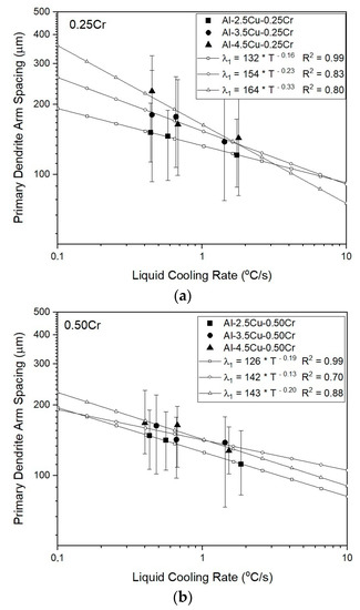 Primary dendrite arm spacing as a function of the liquid cooling rate of the alloy ingots: (a) Al–xCu–0.25Cr; (b) Al–xCu–0.50Cr.