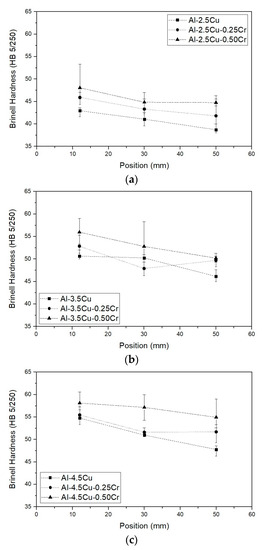 Variation of Brinell hardness with position along the length of the alloy ingots: (a) Al–2.5Cu–xCr; (b) Al–3.5Cu–xCr; (c) Al–4.5Cu–xCr.