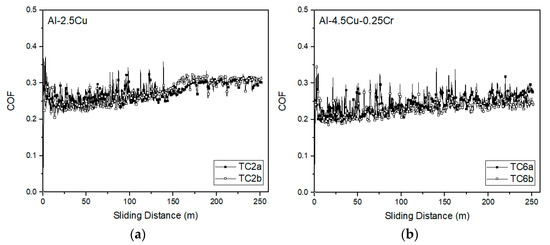 Coefficient of friction (COF) as a function of sliding distance and thermocouple position: (a) Al–2.5Cu alloy—TC2 (thermocouple at 12 mm); (b) Al–4.5Cu–0.25Cr alloy—TC6 (thermocouple at 50 mm).