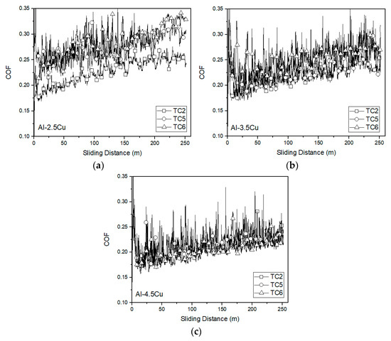 Coefficient of friction (COF) as a function of sliding distance for binary alloys: (a) Al–2.5Cu; (b) Al–3.5Cu; (c) Al–4.5Cu.