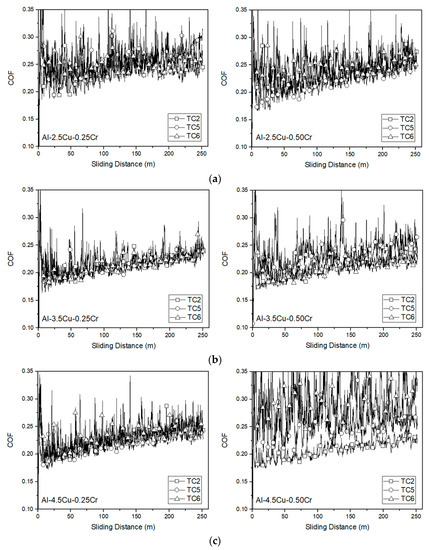 Coefficient of friction (COF) as a function of sliding distance for ternary alloys: (a) Al–2.5Cu–0.25Cr and Al–2.5Cu–0.50Cr; (b) Al–3.5Cu–0.25Cr and Al–3.5Cu–0.50Cr; (c) Al–4.5Cu–0.25Cr and Al–4.5Cu–0.50Cr.