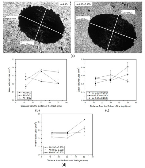 (a) Examples of wear track surfaces of the Al–4.5Cu and Al–4.5Cu–0.50Cr alloys; average wear volume loss as a function of the distance of the bottom of the ingots for all alloys: (b) Al–xCu, (c) Al–xCu–0.25Cr, and (d) Al–xCu–0.50Cr.