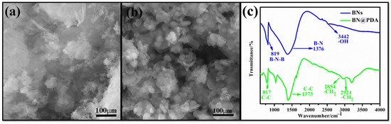 Figure 1. Comparison of SEM images (a,b) and FTIR spectra (c) of BNs (a,c) and PDA@BNs (b,c).