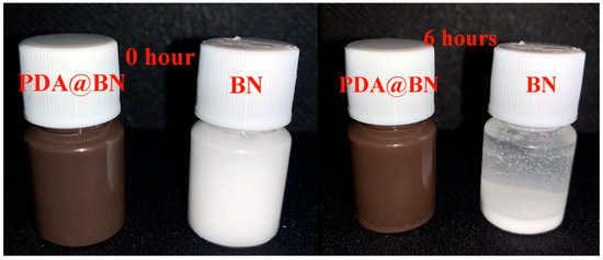 The chemical stability of boron nitride nanosheets, challenging to alter, can be modified by utilizing poly(dopamine), as demonstrated in Figure 2 [30]. The dispersion stability of boron nitride and poly(dopamine)-modified boron nitride nanosheets (0.60 g/L) after 15 min of sonication in a phosphating fluid exhibited white and greyish brown colors, respectively, as shown in Figure 2. However, boron nitride nanosheets (BNs) were precipitated at the bottom of the bath. Nevertheless, the h-BN@PDA particles were well dispersed after 6 h, suggesting that the PDA layers were successfully applied to the BNs nanosheets, as the modified sheets no longer showed compatibility with the phosphating solution.