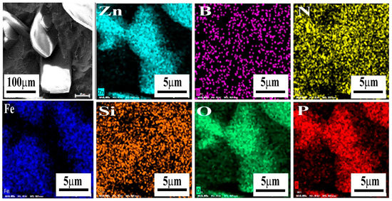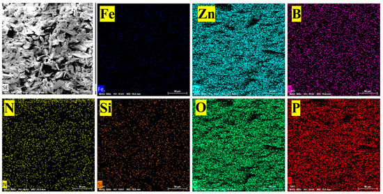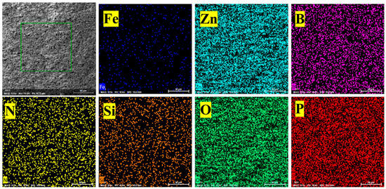 An investigation of the elemental distribution of the phosphate coating was performed utilizing an energy-dispersive spectrometer (EDS) mapping at 20.0 kV. It was performed on the steel specimen surface at 25 °C, 45 °C, and 55 °C temperatures. Figure 4, Figure 5 and Figure 6 illustrate the resulting surface morphology and elemental distribution. The O and P elements characterize the phosphate salts, with a homogenous occurrence across the substrate, suggesting that the phosphate samples consisted of crystals with varying components and appearances. An increase in concentrations of the Fe element was noted, which may stem from phosphophyllite Zn2Fe(PO4)2·4H2O, P–Fe–Zn crystals, or from the steel itself. Since the phosphate coating is porous, the penetration of the electron beam may explain the high readings for Fe. In addition, an increase in Zn2+ ion concentrations was observed in the phosphate crystals compared to those at the gaps. Mappings of B, Si, and N elements were also seen on the samples due to the compactness of the phosphate coating. The elemental distribution of the S-25 sample in Figure 4 clearly shows that a significant portion of the sample is uncoated. Only a small number of phosphate crystals are present, similar to the SEM analysis in Figure 3c. However, Si, B, and N mappings appeared on the sample regions, forming a smooth silane film over the sample.