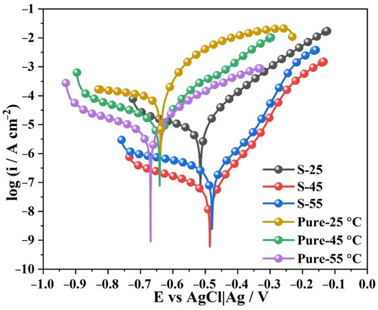 The Tafel extrapolation method was employed to evaluate the potentiodynamic polarization curves and various electrochemical parameters, including potential (Ecorr), anodic (βa), and cathodic (βc) slopes, as well as corrosion density, as listed in Table 1. The corrosion potential of the samples containing incorporated modified boron nitride, denoted as S-25, S-45, and S-55, was observed to be positively shifted compared to the untreated samples (Pure) at temperatures of 25 °C, 45 °C, and 55 °C, as depicted in Figure 7. This shift towards a more positive potential indicates an improvement in corrosion resistance.