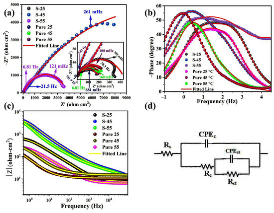 Electrochemical impedance analysis evaluated the phosphate coating’s anti-corrosive performance on the zinc-phosphate steel. EIS measurements were conducted on pure 25, pure 45, pure 55, S-25, S-45, and S-55 samples, with the results displayed in Figure 8a–c as Nyquist, Bode, and phase angle graphs, respectively. The impedance was measured in a 3.5% NaCl solution at the open circuit potential. An investigation was carried out to evaluate the anti-corrosive properties of zinc phosphate coatings on steel specimens treated with modified hexagonal boron nitride (h-BN) nanosheets compared to untreated samples employing Zsimpwin software. This enables a comprehensive analysis of the electrochemical behavior of the coatings and corrosion resistance. The EIS data were analyzed using Nyquist and Bode plots. The impedance is a complex quantity comprising a real Z′ and an imaginary component Z″. The Nyquist plots revealed the existence of a capacitive loop at high frequencies and an inductive loop at low frequencies, indicating the effectiveness of the modified h-BN nanosheets in reducing corrosion. The system’s behavior was examined using EIS tests performed at room temperature on BN-coated steel samples to determine linearity, causality, and durability [34]. Figure 8d illustrates a circuit compatible with the Nyquist diagram. The phosphate coatings prepared at 45 °C exhibited the highest polarization resistance, as evident from Table 1. Additionally, they demonstrated the most negligible corrosion current density. These favorable outcomes can be attributed to the more compact and condensed structure of the coating. It was reported that the formation of phosphophyllite was increased due to a slow reaction during zinc phosphating [35]. While high temperatures increase the reaction rate, they also reduce the amount of phosphophyllite phase.