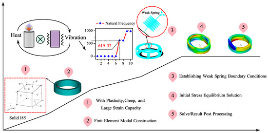 (1) Based on the creep mechanism of thermal aging and the principle of vibration aging, this paper conducted a simulation of residual stress control of 2219 aluminum alloy rings during TVSR using ANSYS. The simulation results show that the derived constitutive model can describe the stress relaxation process of TVSR by combining a single thermal time effect stress relaxation constitutive theory with a vibration aging plastic deformation material model.