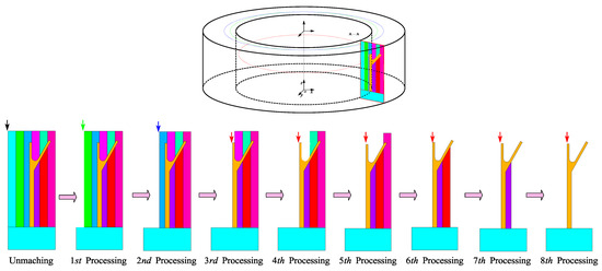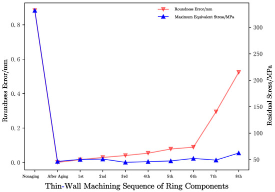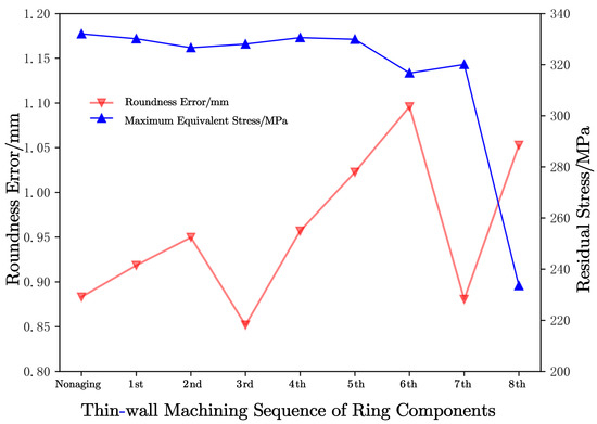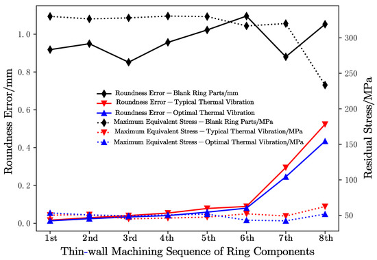 (5) Under the optimal thermal–vibration parameters, the roundness error in the 7th and 8th processing stages increased from 0.0798 mm to 0.2454 mm and 0.4341 mm, respectively, compared to the 6th processing stage, with an increase rate of 207.4% and 443.9%, respectively. Under typical thermal–vibration parameters, the roundness error in the 7th and 8th processing stages increased from 0.0889 mm to 0.2948 mm and 0.5236 mm compared to the 6th processing stage, with an increase rate of 231.4% and 488.6%, respectively. Therefore, in the final stage of thin-walled ring processing and forming, the processing process plan should be adjusted to improve the accuracy of thin-walled ring processing and forming after TVSR.