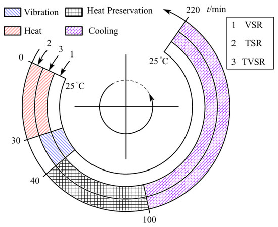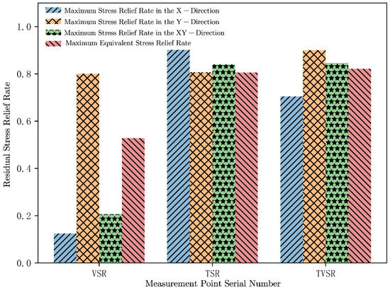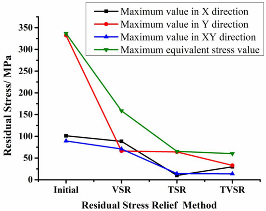 8] studied the residual stress and microstructure differences of Ti6Al4V titanium alloy under three different aging techniques: TSR, VSR, and TVSR. The results showed that TVSR and TSR were able to eliminate more than 90% of residual stress, but the removal efficiency of TVSR was 4.2 times that of TSR. Meanwhile, the elimination efficiency of TVSR is 45.04% higher than that of VSR. Chen et al. [