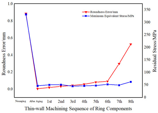 This paper takes 2219 aluminum alloy rings as the research object, and combines the constitutive theories related to thermal aging and vibration aging to establish an ANSYS numerical simulation finite element model. The initial residual stress of the ring blank was measured using the drilling method experiment, and the creep constitutive coefficient of 2219 aluminum alloy was determined through stress relaxation test. VSR, TSR, and TVSR numerical simulation calculation processes were compared and established. At the same time, numerical simulation technology was used to study how the initial residual stress in the blank causes the deformation of the ring during the thin-walled machining process. The roundness error theory of the minimum containment area method was applied to evaluate the deformation degree during the thin-walled numerical machining process, and the TVSR method was used for stress regulation. The deformation law of the thin-walled machining of the ring under different aging parameters was studied. The conclusions are as follows: