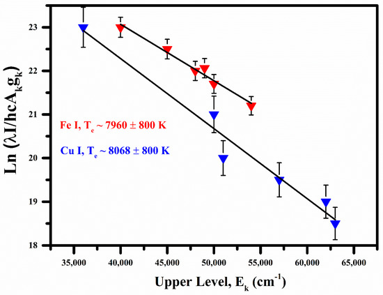 We have measured the plasma excitation temperature from the relative spectral intensity of the emission lines of iron and copper using the following Boltzmann equation [28,29,30,31,32]: