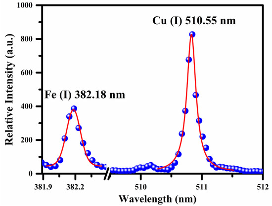 where FHWM is the full width at half-maximum (FWHM), stark broadening parameter was taken from the literature [27] for Cu and Fe atomic emission lines at various temperatures, is the reference number density ( cm−3 for the neutral species and cm−3 for singly ionized species). The FWHM of the Cu and Fe emission line was calculated using the Voigt fit to the line profile by considering the Stark width (ωs), 0.06 ± 0.01 nm instrumental width, and 0.005 nm the Doppler width, respectively. The estimated average value of plasma number density from the Stark broadened line profiles of Fe and Cu is . In Figure 4, the dots signify the experimental data, and the red lines show the Voigt fitting.