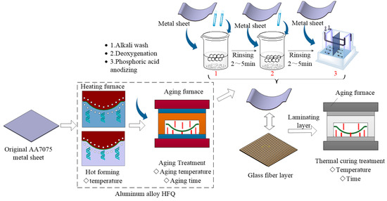 For the aluminum alloys used in the aerospace field, Al–Cu–Mg alloys (2000 series), Al–Mg–Si alloys (6000 series), and Al–Zn–Mg alloys (7000 series) are all heat-treatable aluminum alloys [24,25,26,27,28,29]. Among them, the 7000 series aluminum alloys have higher strength, and their tensile strength can reach more than 500 MPa. However, these alloys have a low plastic elongation at room temperature and are easy to crack in traditional stamping, which limits the abroad application. Therefore, the 2000 series Al–Li alloy is adopted in the manufacturing process of conventional FMLs parts [30]. As the competition for military equipment is becoming increasingly fierce, higher demands for aviation equipment and materials, have been put up, such as lighter weight, higher strength, better impact resistance, and fatigue performance. To obtain structural components with high strength and complex shapes, the 7075-aluminum alloy was used in the HFQ-FMLs formation process of FMLs. Firstly, by utilizing hot stamping process routes, the thermal plasticity of the material was improved to solve the problem of small deformation limit and cracking effectively, the movement time of the die was designed for about 10 s to reduce the heat loss of the plate, and the stamping temperature is 400–420 °C in which the metal plate deforms successfully. Secondly, the aluminum alloy parts were subjected to an artificial aging treatment so that the strengthening phases in the material were uniformly precipitated to improve the strength and rigidity of the material. Finally, the thermal curing treatments were carried out to ensure sufficient adhesion between these hybrid materials and to prevent peeling during use. The innovative HFQ-FMLs compound-forming process is shown in Figure 1.