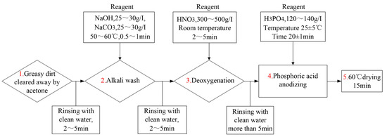 Then, the obtained metal was dealt with a surface chemical treatment to ensure excellent adhesion quality between the metal and fiber composite materials [32]. The surface treatment process is shown in Figure 2.