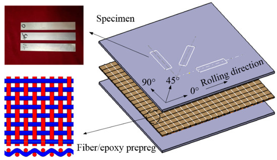 The manufacturing process of the tensile specimens is shown in Figure 6. For the surface treatment of the metal sheets, in the alkali wash process, the reagent is the mixture of NaOH and Na2CO3, while, In the deoxygenation process, the reagent is HNO3, and the concentration is 300–500 g/L. In the phosphoric acid anodizing process, the reagent is H3PO4, and the concentration is 12–140 g/L. In the tensile procedure, the effects of the metal sheet rolling direction and strain rate on the mechanical properties of FMLs were analyzed, and the process designability and fracture development of the composite materials will be studied at the same time.