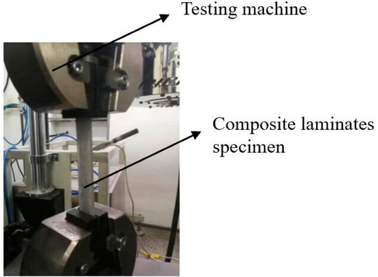 Because of the influence of the fiber direction, the behavior of most FMLs is anisotropic. The metal sheet is directional due to the rolling process at the same time. At present, there are many research reports on the influence that fiber direction has on the performance of FMLs. However, there are few reports about the influence of the metal sheets’ direction. Therefore, to study the influence of the anisotropy performance of aluminum alloy and strain rates on the mechanical properties and fracture evolution of FMLs laminates, the new GLARE laminates were carried out in the tensile tests in different directions and with varying rates of strain. Firstly, the aluminum alloy sheets were sampled along the directions of 0°, 45°, and 90° with the rolling direction, and the samples were long strips with a length of 175 mm and a width of 25 mm. To avoid the influence of the fiber orientation on the FMLs, the fiber orientation is fixed when the metal orientation is variable. So, when the angle between the sampling direction of the metal layer and the rolling direction is 45°, the composite laminates are stretched, and the angle between the fiber orientation and the tensile direction is 45° all the time. Secondly, the aluminum alloy samples were processed using HFQ technology. Thirdly, the aluminum alloy samples with the HFQ process were bonded with the glass fiber/epoxy resin prepreg to obtain standard tensile samples of HFQ-FMLs composite laminates in different metal directions, as shown in Figure 4. The tensile tests were carried out on a CTM 100 G universal testing machine which was manufactured by Xie Qiang Instrument Manufacturing (Shanghai) Co., Ltd. from Shanghai, China, and it is shown in Figure 5. The whole process was controlled in the form of load rates, which were converted into strain rates of 0.001 s−1 and 0.01 s−1. To prevent the holding end of the composite material specimens from being crushed during the stretching process, the aluminum reinforcement sheets were pasted at both ends.