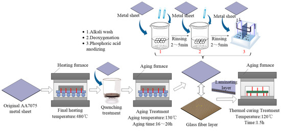 The surface treatment process includes four steps: acetone cleaning, alkaline cleaning, deoxidation, and phosphoric acid anodization. The process was used mainly to clean the oil stain on the sheet’s surface, to change the surface state of the metal layer, and to improve the connection between the fiber and metal layers, which will reduce delamination risk [33].