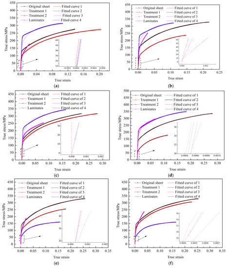 To comprehensively analyze the difference in plastic fluidity and mechanical properties of the raw metal sheet, the original metal sheet, aluminum alloy dealt with solution treatment and quick quenching only, aluminum alloy plate disposed of with HFQ technology, and the HFQ–FMLs composite laminates were subjected to the unidirectional tensile test under the same conditions. These are marked as original sheets, treatment one plate, treatment two plates, and laminates. The true stress-strain curves of the four kinds of materials were obtained through data processing and fitting, and the results are shown in Figure 7. The curves are engineering stress and strain curves which can directly express the changing trend of the stress. According to the study, the strength limit and deformation limit it is helpful to make sure of the optimal forming route. Therefore, the descending part of the curve is deleted.