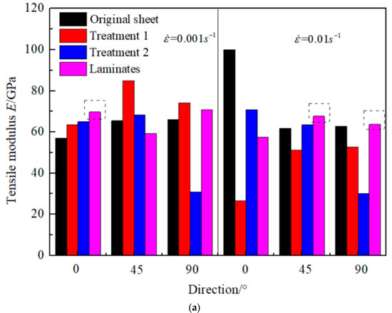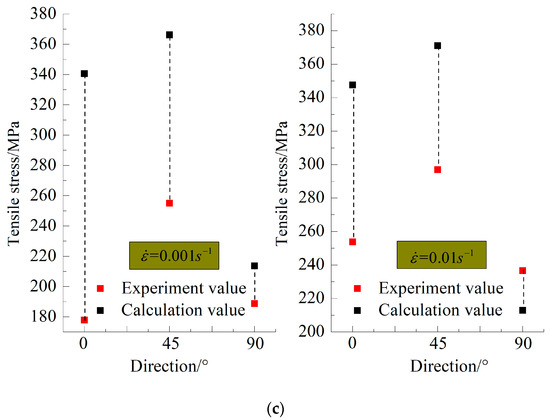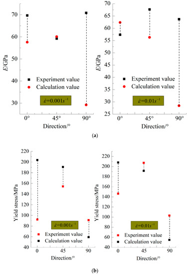 For the modulus of elasticity, yield stress and tensile stress, it was shown in Figure 10 that there exist different deviation degrees between the experimental results and calculations, and it is indicated that the influence of alloy orientation on the FMLs obtained by the HFQ-FMLs technology is random and there is no regular. The strain rate has little effect on the error level between the experimental and calculated values of the tensile properties of the HFQ-FMLs composite laminates. Instead, the direction of the metal sheet has a significant effect on the error level. When the strain rate is 0.001 s−1, the deviation between the experiment value and calculation value of tensile modulus is minimum along the 45°. It is almost 0, and the maximum error values exited along the 90°. When the strain rate is 0.01 s−1, the deviation between the experiment value and calculation value of yield stress is not more than 10% along the 45°, and the maximum error values exited along the 90° too. At the same time, the deviation between the experiment value and calculation value of tensile stress is not more than 20% along the 90°, while the maximum error values exited along the 0° and 45°, respectively. Therefore, the theoretical predictions of the tensile properties of HFQ-FMLs composite laminates are directional and can be designed along certain directions of the metal sheet. The tensile modulus of HFQ-FMLs composite laminates can be theoretically predicted along the 0° and 45° directions, the tensile yield strength can be theoretically predicted along the 45° and 90° directions and the ultimate tensile strength can be theoretically predicted along the 90° direction. This comprehensively shows that the anisotropy of the metal sheet is an essential factor influencing the performance difference of the FMLs.