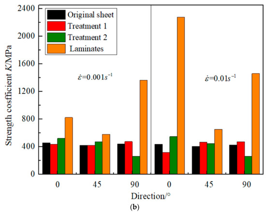 Figure 8b shows that the distribution of K characterizes the plastic deformation stiffness, and the HFQ-FMLs composite laminates have obvious advantages under different strain rate conditions. This is because the longitudinal tensile limit of the glass fiber/epoxy composite material is higher than that of the metal layer. When the outer metal yields and enters the plastic deformation stage, the “bridging effect” of the two kinds of materials delays the time to reach the tensile limit of the composite laminates. As the strain rate increases, the direction of the composite laminates that have superior stiffness changes from 90° to 0°, and this indicates that the plastic deformation ability of the composites is higher along the 0° and 90° directions.