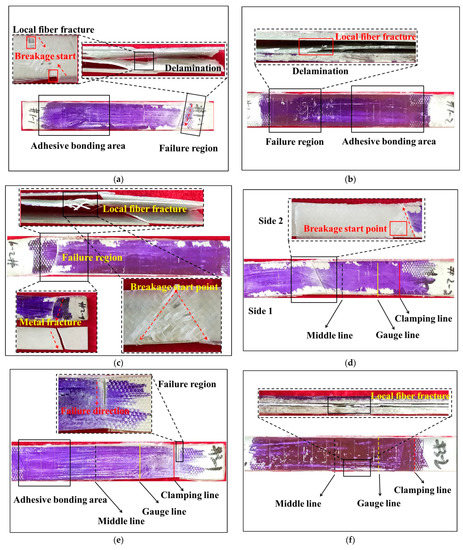 After the tensile experiments for all the specimens, the observations of the enlarged image of the morphology were shown in Figure 11.
