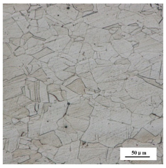High nitrogen steel with a size of 90 × 27 × 4.5 mm was selected, and its composition is shown in Table 1. As shown in Figure 1, the metal displays a single austenite with a flat grain boundary of the austenite and fine grain size. In addition, the high nitrogen steel has an average hardness of 383 HV, and a tensile strength of 1040 MPa.