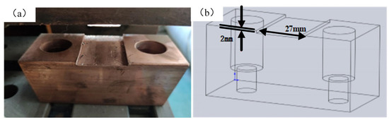 Flash-butt welding was conducted with ZUN-100-012-0008A equipment, which was manufactured by Quancheng Machinery Equipment Co., Ltd. in Jining City, Shandong Province, China. A set of suitable electrodes was designed according to the sample size. Figure 2 shows a digital photograph and three-dimensional design of the electrode, where grooves are processed on the electrode surface to avoid rotation and dislocation of the weldment during the welding process.