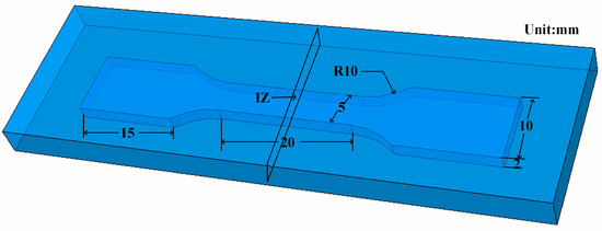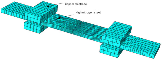 The flash-butt welding of high nitrogen steel involves a complicated interaction process of heat, electricity and force [17,18]. The calculation and analysis conducted were based on abaqus 2016 software of the American company 3DEXPERIENCE. Before establishing the model, reasonable assumptions and simplified treatment were made as follows. First, the electrode size was simplified and the direct contact resistance between the copper electrode and the high nitrogen steel was ignored. Second, the heat generation of current and resistance was transformed into heat source substitution. Third, the plate end contact had a smooth surface with an unchanged contact area between the plate and the electrode.