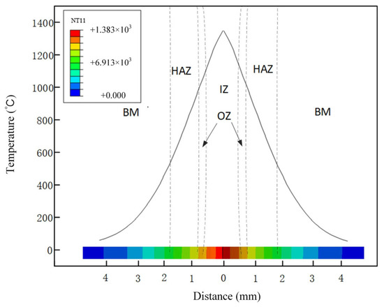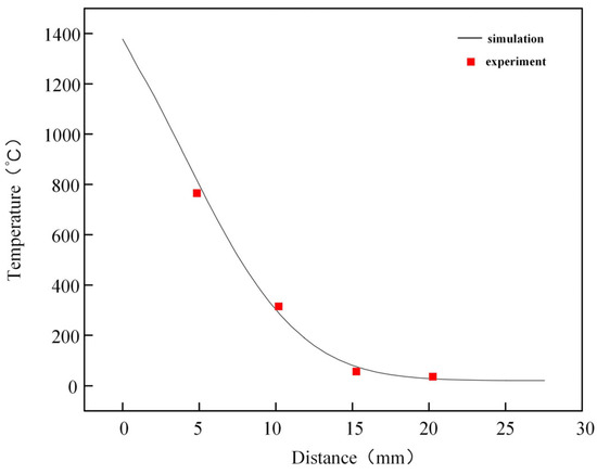 Temperature measurement analysis was carried out in the flash-butt welding process of high nitrogen steel to verify the accuracy of the finite element model. Figure 6 shows the comparison between the simulated and measured temperature results. The actual welding temperatures are distributed on both sides of the simulated temperature curve with a high coincidence degree, indicating that the finite element model established exhibits a high accuracy with the actual welding situation.