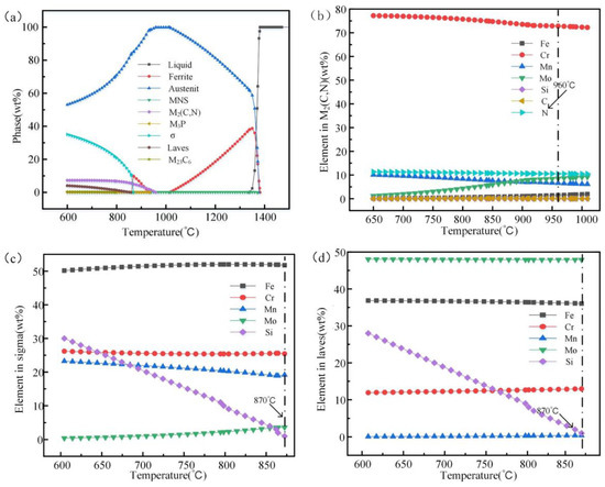 The flash-butt welding process of high nitrogen steel includes heating, melting, cooling, and solidification, accompanied by mechanical forces. In this process, the supersaturated nitrogen dissolved in the metal is precipitated as N2 or nitride. The second phase precipitation or nitrogen pores lead to a decrease in mechanical properties. Thus, JMat Pro software was applied to predict the equilibrium phase diagram of the precipitated phase in high nitrogen steel. At a temperature of 960 °C, almost all the microstructure was transformed into austenite, with only a small amount of the MNS phase. High-temperature ferrite (δ-F) was produced at approximately 1010 °C, and maintained until 1390 °C for complete melting. The highest precipitation temperature of the M2 (C, N) phase was approximately 960 °C, which mainly belongs to the Cr2 (C, N) phase, as shown in Figure 7b. The highest precipitation temperature of the σ phase was approximately 870 °C. As can be seen from the element composition diagram in Figure 7c, when the σ phase was near 870 °C, the Fe element became the most abundant element and accounted for approximately 50%, with other elements of Cr, Mn, and Mo. The maximum precipitation temperature of the Laves phase was approximately 870 °C, similar to that of the σ phase. The leaf phase was mainly composed of Mo, Fe, Cr, and other elements, as shown in Figure 7d.