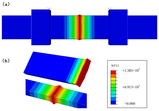 Simulation results: (a) Joint temperature distribution diagram at the flash stage; (b) Temperature distribution inside the connector.