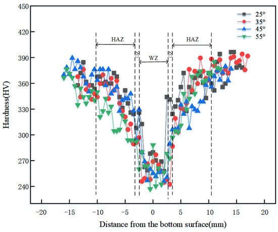 The overall hardness of flash-butt welding joints displayed a “V” shape. The interface exhibited the lowest hardness, and the hardness gradually increased with the distance from the interface area. Although the interface presented fine grains, the austenite phase zone decreased due to the precipitation of nitrogen, and the hardness decreased with increasing ferrite content. Figure 14 shows the microhardness with different thyristor angles. The joint hardness reached the lowest value of 237 HV at 55° because the relatively small, recrystallized grains in the interface area were excessively extruded, resulting in relatively coarse grains at the interface. Therefore, the joint hardness in the interface reached the lowest value. When the thyristor angle was 25°, 35° and 45°, the hardness reached 252 HV, 246 HV and 247 HV, respectively.
