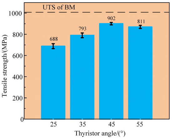 Figure 15 shows the tensile strength of the joint at different thyristor angles. The joint sample at different thyristor angles displayed a lower tensile strength than that of the base material. The tensile strength first increased and then decreased with increasing thyristor angle, and reached 902 MPa at 45°, which was 86.4% of the tensile strength of the base material. The tensile strength decreased to 811 MPa at 55 °C, mainly due to a large plastic zone and a high plasticization degree induced by the increased heat input in the weld. The high degree of plastic deformation and the increased plastic heat resulted in an improvement in the mechanical properties of the weld. The plastic zone became larger at 55° due to the excessive heat input, and the corresponding dynamic recrystallized grains of the joint were severely extruded. Therefore, the joint microstructure exhibited relatively coarse grains, leading to a reduction in tensile strength.