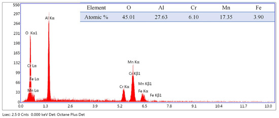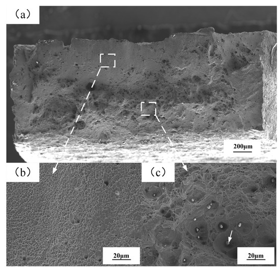According to the joint hardness and tensile properties, the optimal parameters of the flash-butt welding process were determined to be the thyristor conduction angle of 45°. As shown in Figure 16a, the macroscopic fractures presented uniform and ductile fractures. Figure 16b,c are partially enlarged views of Figure 16a. Zone b displayed small and uniform tear margins and dimples, without visible precipitated phases. Zone c, located in the center, showed larger and deeper dimples than those in zone b, located at the edge, and contained a number of precipitated phase particles. The element composition of the precipitated phase was determined by EDS analysis, and the result is shown in Figure 17. Atomic percent of Cr was 6.10, atomic percent of Mn was 17.35 and atomic percent of Fe was 3.9.