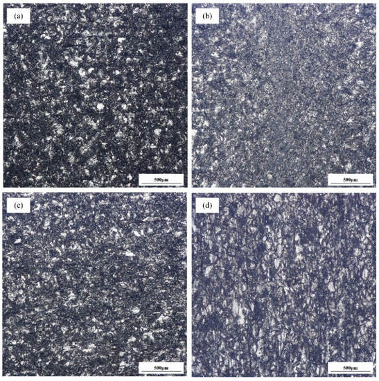 As shown in Figure 10, the microstructures of the interface zone at 25°, 35°, 45°, and 55° were composed of austenite and ferrite. The ferrite was distributed at the austenite grain boundary. Due to the low heat input at the joint interface, there is less molten material on the end face, resulting in flash flow. The molten liquid metal remained at the interface and was finally welded together through the action of the forging force. The welding heat input increased and the grain grew with an increasing thyristor angle. The terminal metal was heated sufficiently, and the plastic zone became larger at 45° and 55°, as shown in Figure 10c,d. In the process of upsetting, all the melted metals were extruded, and the plastic metals underwent dynamic recrystallization under the forging force and high temperature. When the thyristor angle was 55°, the interface area heat input increased. The dynamic recrystallization part became the extruded part due to the upsetting force, and the interface area displayed insufficient dynamic recrystallization and uneven grain size.