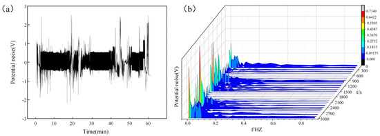Figure 20b shows the noise potential in the frequency domain. The joint corrosion potential was concentrated in the low-frequency region, and the potential fluctuated at 300 s. The potential fluctuated periodically with increasing time, mainly related to the charging/discharging process on the electrode surface. Each potential fluctuation corresponded to the nucleation and growth of an etch, and the recovery of the potential corresponded to the extinction of the etch. The potential recovery rate corresponded to the extinction rate of the etch [26].