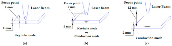 Scheme of a CO2 laser beam focus position used: (a) focus point = 2 mm, (b) focus point = 7 mm, (c) focus point = 12 mm.