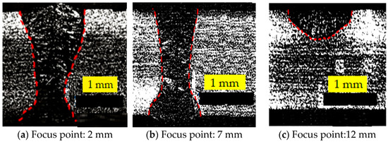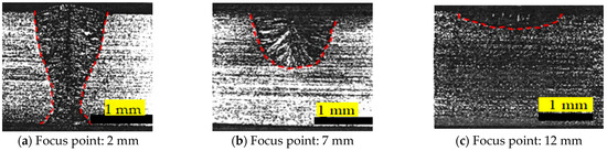 Figure 9 shows the micrographs of impact of focus point on 316 LS laser weld carried out under power 3000 w, speed welding 3000 mm.min−1, shield gas (70% He + 30% Ar) for different focus points. One can notice that for focus points at 12 mm and 7 mm, the welds were partially penetrated, as depicted in Figure 9b,c. The heat required for fusion comes from the surface by conduction and as a result a low depth of penetration occurs. At 2 mm focus point, the keyhole mode occurs with a narrow and deep hole, as shown in Figure 9a.