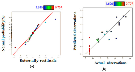 The significance of the proposed model can be noticed via the statistical analysis. Figure 14a shows the normal plot of residuals and the Figure 14b predicted against the actual transformed data. As shown, the plots are well distributed around the reference lines. Scanty residuals, as depicted in Table 16, indicate a good accuracy of the regression model. The ANOVA results confirm the statistical significance of the proposed formulation, as listed in Table 17. The statistical indicators are as follows: F-value = 56.3, R² = 0.9935, the adjusted R² = 0.9759, the predicted R² = 0.8668. The values of the adjusted R² and the predicted R² indicate a reasonable agreement where the difference between them is small (less than 0.2), indicating the statistical significance of the equation. Moreover, the signal-to-noise ratio is sufficiently good, S/N = 30.15 (values > 4 are considered good), which shows the adequacy of the model to represent the data.