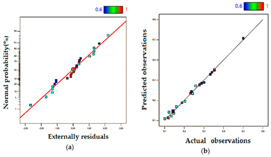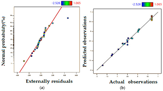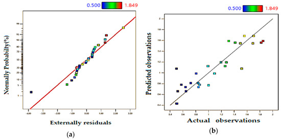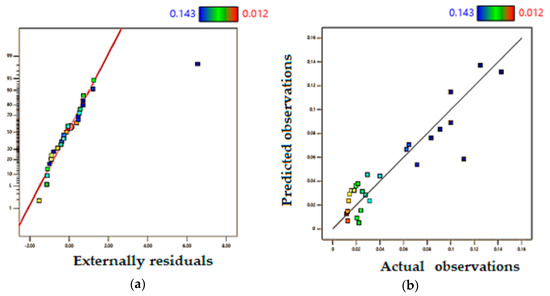 The significance of the proposed model can be noticed via the statistical parameters. Figure 3a shows the normal plot of residuals and Figure 3b the predicted transformed data against the actual transformed data. The normal plot of residuals depicts that the residuals (errors) are approximately normally distributed but there are three outliers. That means the errors are independent and random. Also, this distribution indicates the goodness of the regression model. The ANOVA results confirm the statistical significance of the proposed formulation, as listed in Table 6. The statistical indicators are as follows: F-value = 10.43, obtained R² = 0.8467, adjusted R² = 0.7656, and predicted R² = 0.6737. The values of the adjusted R² and the predicted R² indicate a reasonable agreement where the difference between them is small and is (less than 0.2) indicating the statistical significance of the equation. Moreover, the signal-to-noise ratio is sufficiently good, S/N = 10.1226 (values > 4 are considered good), which shows the adequacy of the model to represent the data.