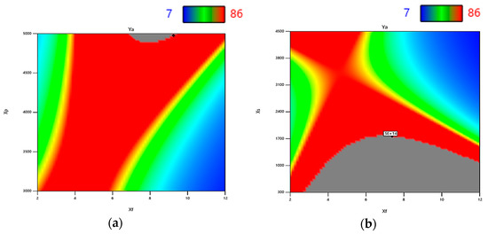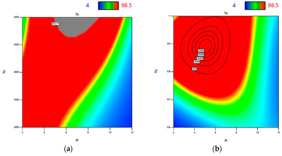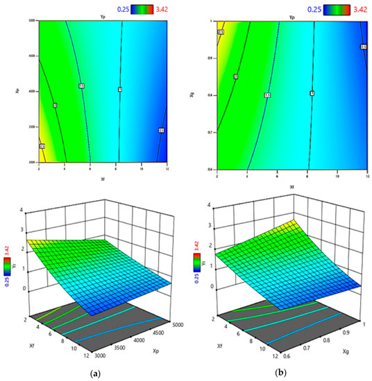 For investigating the significance of the different terms of the equation, the ANOVA results can be used to find the major factors that affect Ya. As shown in Table 17, all the equation terms are significant at 95% confidence level, i.e., p-value < 0.05. After computing the percentage of contribution of each factor, the effect of Xg (= 10%) is found to be greater than the effects of the other factors Xf (= 4.65%), Xs (= 5%), and Xp (= 4.27%). The aggregated effect of the linear model contributes to about 24%. However, the two factor interaction effect of Xf with the different factors forms the main contributors. These effects can be represented by Xf Xp, Xf Xs, and Xf Xg. The three terms represent a contribution of about 29.5% of the data variance of Ya. These interaction effects can be represented in Figure 15 for both Xf Xp in Figure 15a, and Xf Xg in Figure 15b. The other two levels interactions are also significant that includes Xs Xp, Xs Xg and Xp Xg. These three terms contribute about 14.27% of the Ya variation. Moreover, the two factors with linear–quadratic interactions effect are significant. These forms can be represented by Xf Xg² (4.6%), Xf²Xp (2.63%), Xf² Xs (2.55%), and XsXg² (0.49%). These four components are responsible of about 10.27% of the variation of Ya. Accordingly, the two factor interaction is the major factor responsible for the variation of Ya with a total contribution of 54%. The quadratic terms of the Xf2, Xs2 and Xf2 are also significant and affect Ya with reasonable percentage: Xs2 (= 7.12%), Xf2 (= 5.4%) and Xg2 (= 1.86%). Regarding the three factor interactions, only Xf Xs Xg and Xf Xp Xg are significant, with an aggregated contribution of about 4%.