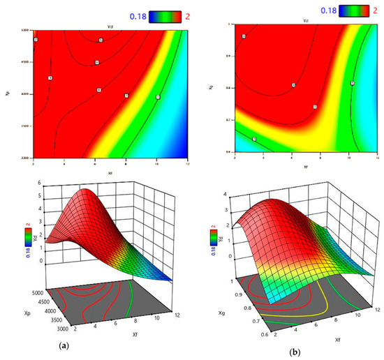 Regarding the effect of the different terms of the equation on Yd, the ANOVA results can be used to find the major factors that affect Yd. The major contributor is the two factors interaction between Xf and Xp which contributes to about 10.65%. The linear effect of Xf is statistically significant. It contributes to about 9.7% of the data variance of the response Yd. The effect of the Xg is also significant, it comes after Xf with a contribution percentage of 7.81%. The effect of Xs is significant; it contributes to about 6.91%. The interaction effect between Xf and Xs contributes to 6.77%. The linear effect of Xs contributes to 6.32%. Moreover, the interaction effect between Xs and Xp contributes to 6.27%. All of these forms of the effect of Xs contributes to about 26.27% of the data variance of Yd. The other significant confronters can be represented by Xp Xg, Xf², Xf Xg², Xf Xg, Xp, Xf²Xs, Xs Xg, Xf²Xp, and Xf Xp Xg; all of these factors contribute to about 40.5 of the variation of Yd. The interaction effect among the four variables is significant at all levels, as shown in Figure 11a for Xf Xp and Figure 11b for Xf Xg with linear and quadratic forms. The three factors interaction is weak and only noticed between Xf Xp Xg with a small contribution of 1.08%.