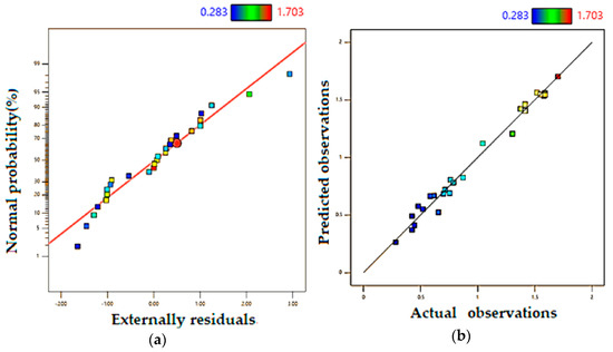 The statistical analysis shows the satisfactory fitting level of the proposed model to represent the observed data. As shown in Figure 5a, the residuals are approximately around the line indicating that the errors are normally distributed; however, there is one outlier point. Moreover, Figure 5b shows a satisfactory distribution of the actual data against the predicted data. The ANOVA results for Yr are listed in Table 8. As shown, the F-value = 12.86 is good with a p-value < 0.0001 which indicates that the proposed equation fits the measured data. The obtained R² = 0.7941, the adjusted R² = 0.7324, and the predicted R² = 0.6268 values can confirm the statistical significance of the mathematical model with an acceptable level. The signal-to-noise ratio, S/N = 10.74 > 4, indicates an adequate signal. Though this statistical analysis shows the proposed relation for predicting Yr in function of the four parameters Xf, Xp, and Xg.